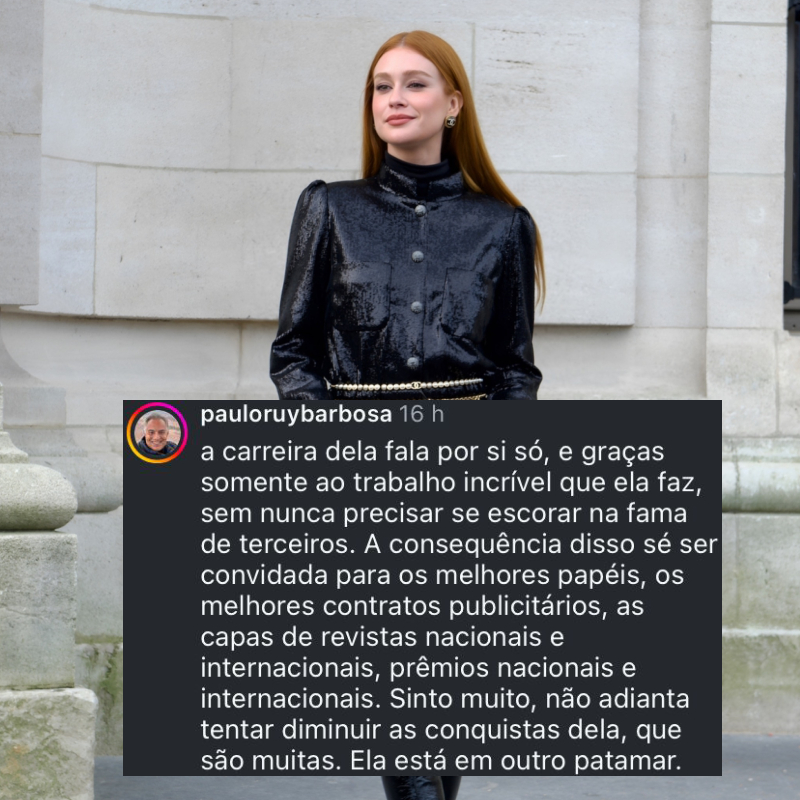 O pai de Marina Ruy Barbosa, b>Paulo Ruy Barbosa, saiu em defesa da filha após alguns haters comentarem em uma publicação na web que mostra a atriz marcando presença no Festival de Cannes. Tudo começou quando a atriz postou seu look no evento que acontece na França - e alguns internautas criticaram a escolha da roupa e também questionaram o motivo dela ter sido homenageada pela Forbes. Um usuário comentou: Atriz que vai aos festivais só para desfilar looks. Nem os colegas, [como] Wagner Moura, fazem uma menção a essa 'estrela'... cinco anos seguidos e até hoje não foi convidada a fazer um trabalho internacional. E o pai dela rebateu: A carreira dela fala por si só, e graças somente ao trabalho incrível que ela faz, sem nunca precisar se escorar na fama de terceiros. A consequência disso é ser convidada para os melhores papéis, os melhores contratos publicitários, as capas de revistas nacionais e internacionais, prêmios nacionais e internacionais. Sinto muito, não adianta tentar diminuir as conquistas dela, que são muitas. Ela está em outro patamar.